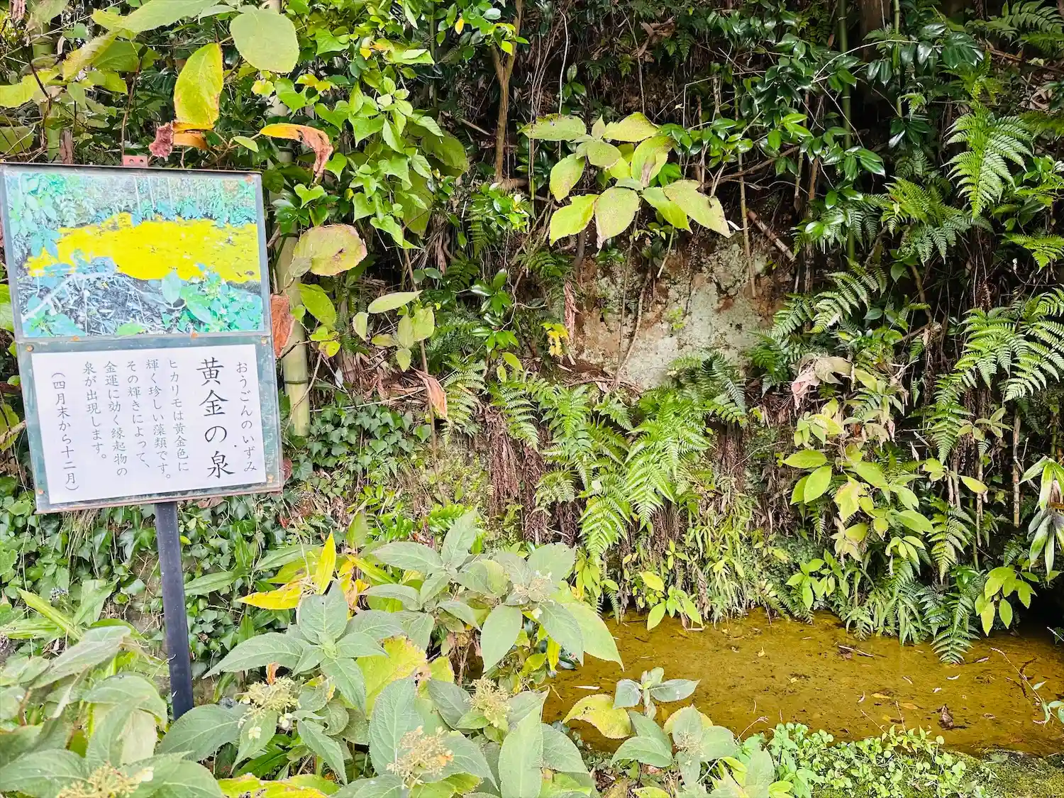 「ヒカリモ」は黄金色に輝く珍しい藻類で、その輝きによって、金運に効く縁起物の泉が出現するそうです。