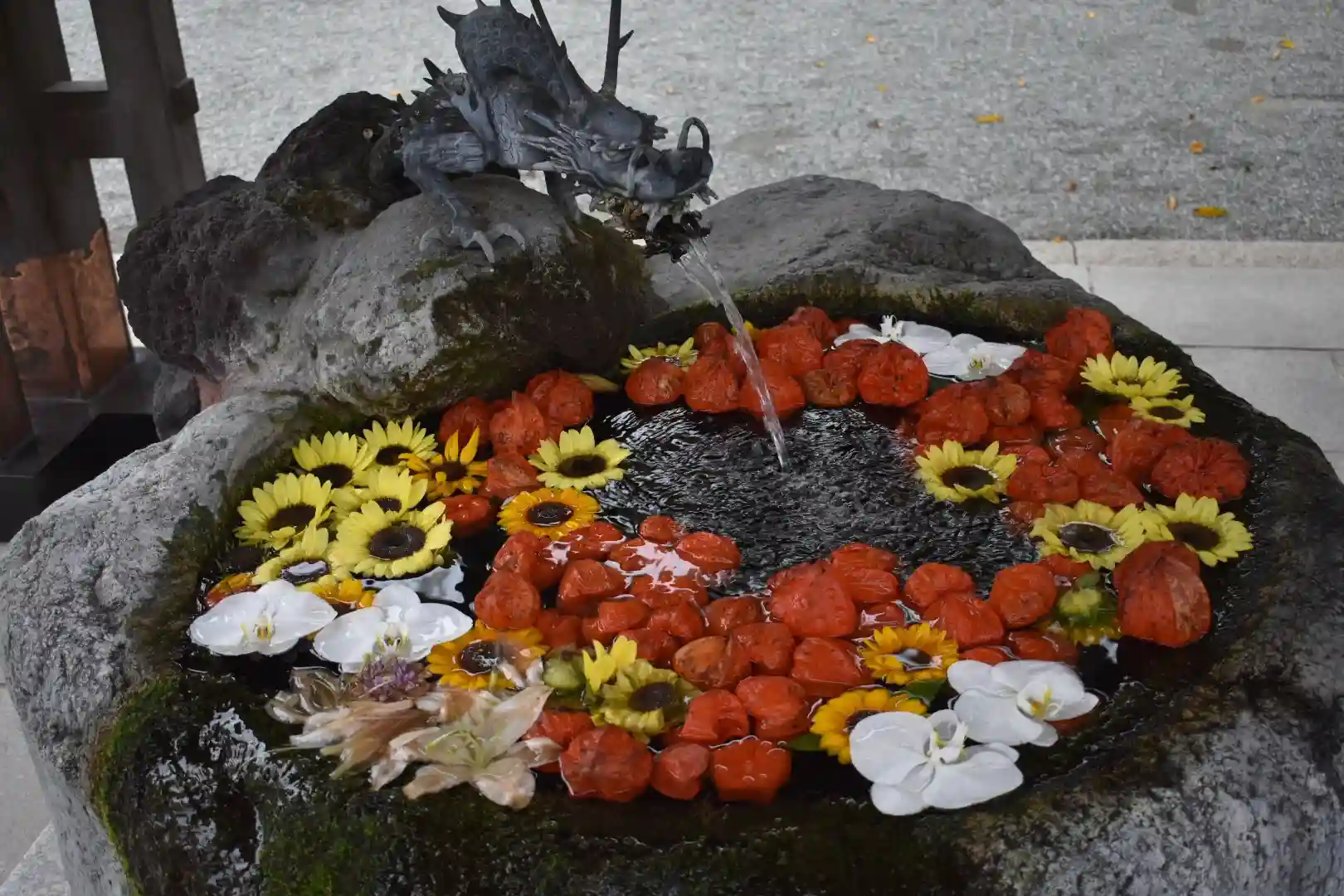 最近流行りの?!花手水です。酸漿や向日葵が浮かび季節をかんじさせてくれます^ ^