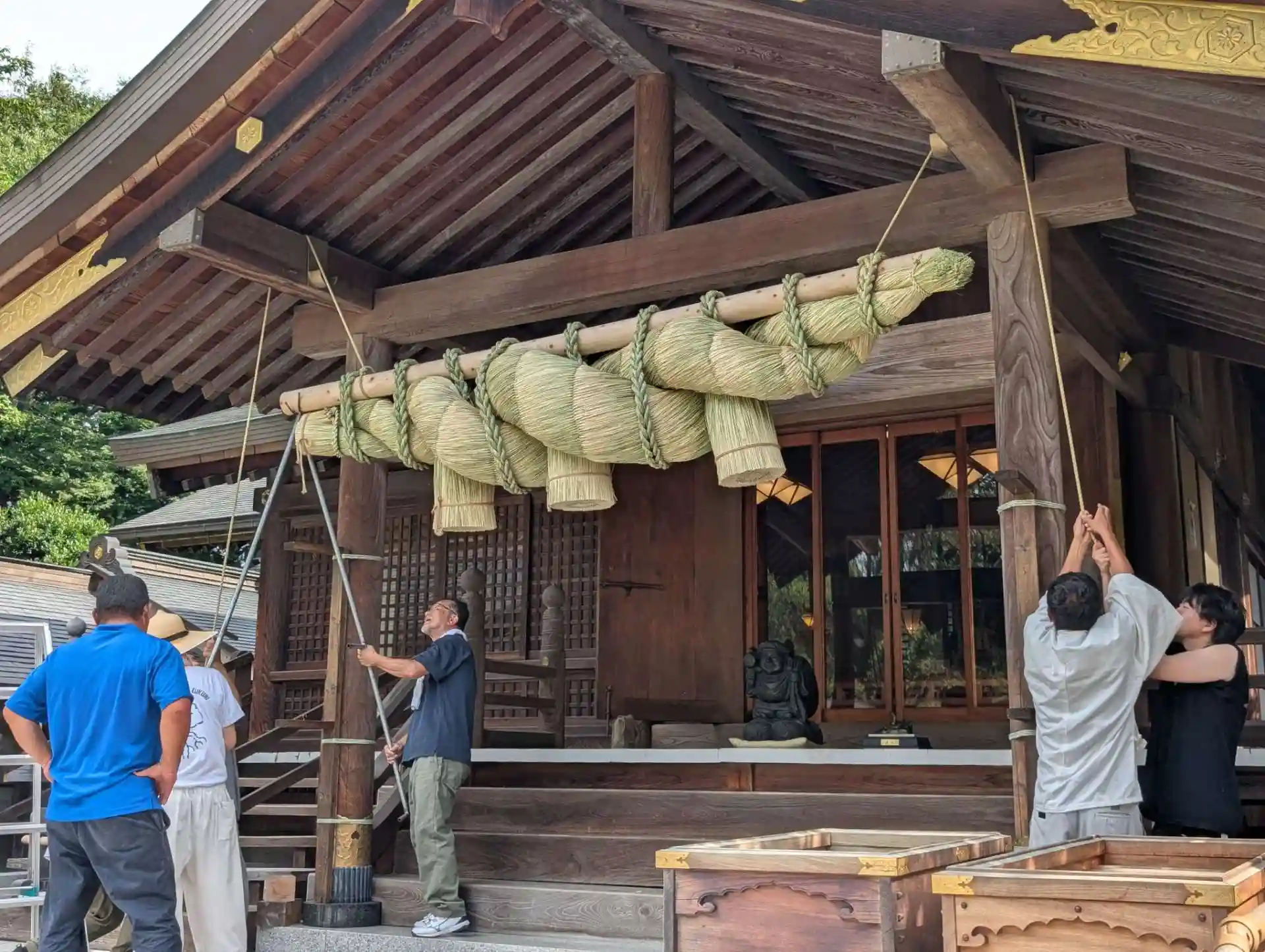 総重量は約120kgともなり、古いしめ縄を下ろして、新しいものを人力で架け替える作業は至難の業。