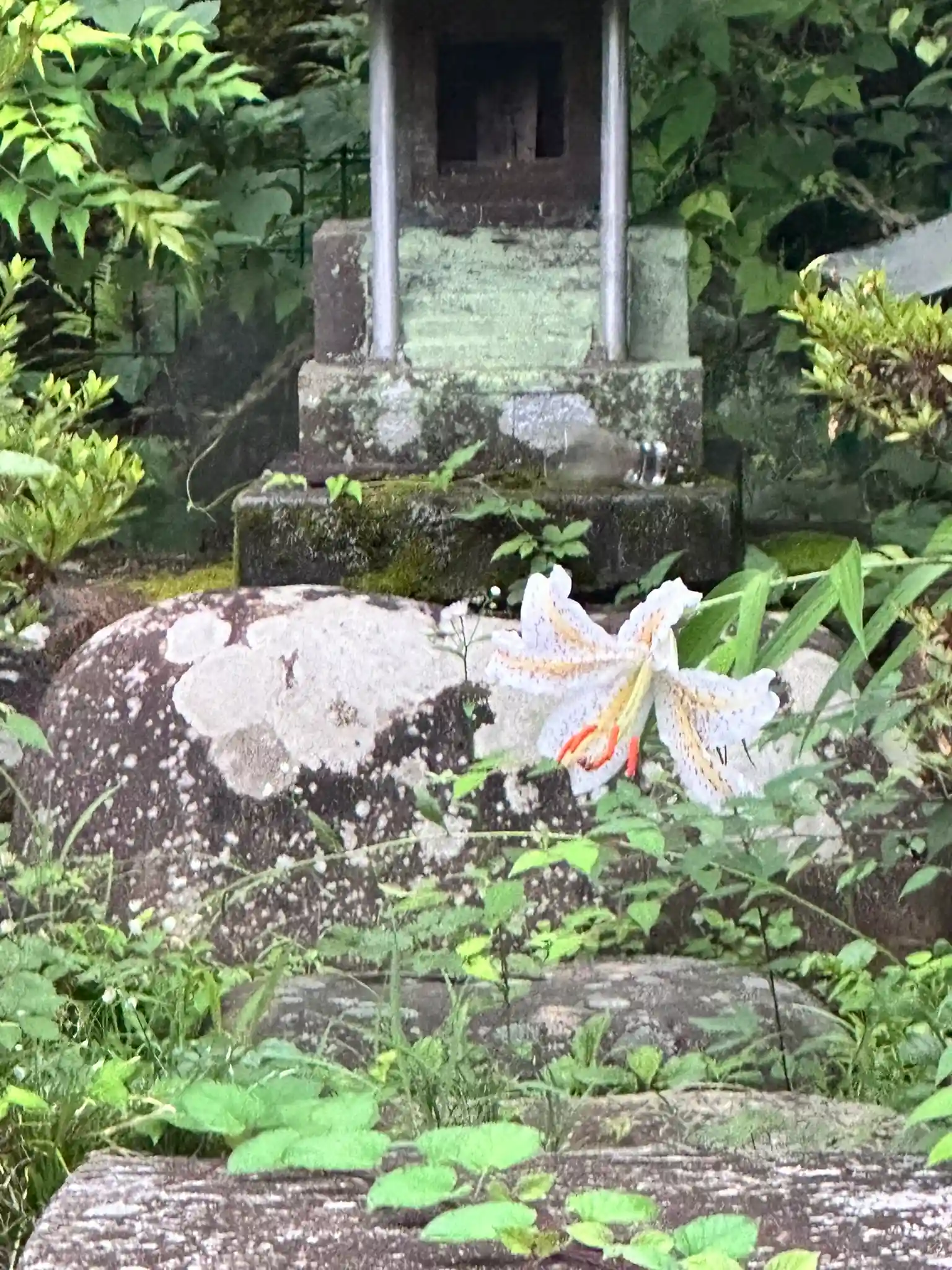 祠の前でユリがさきました。