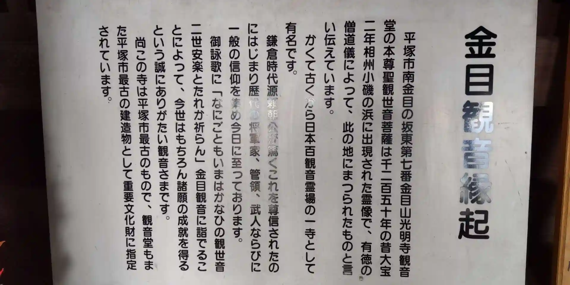 天台宗の寺院。山号は金目山。ご本尊は聖観世音菩薩。坂東三十三観音第七番札所。平塚市最古の本堂の寺院です。60年に一度の寅年に御開帳される秘仏です。境内に水琴窟がありました。とても心地良い音色がしていました。