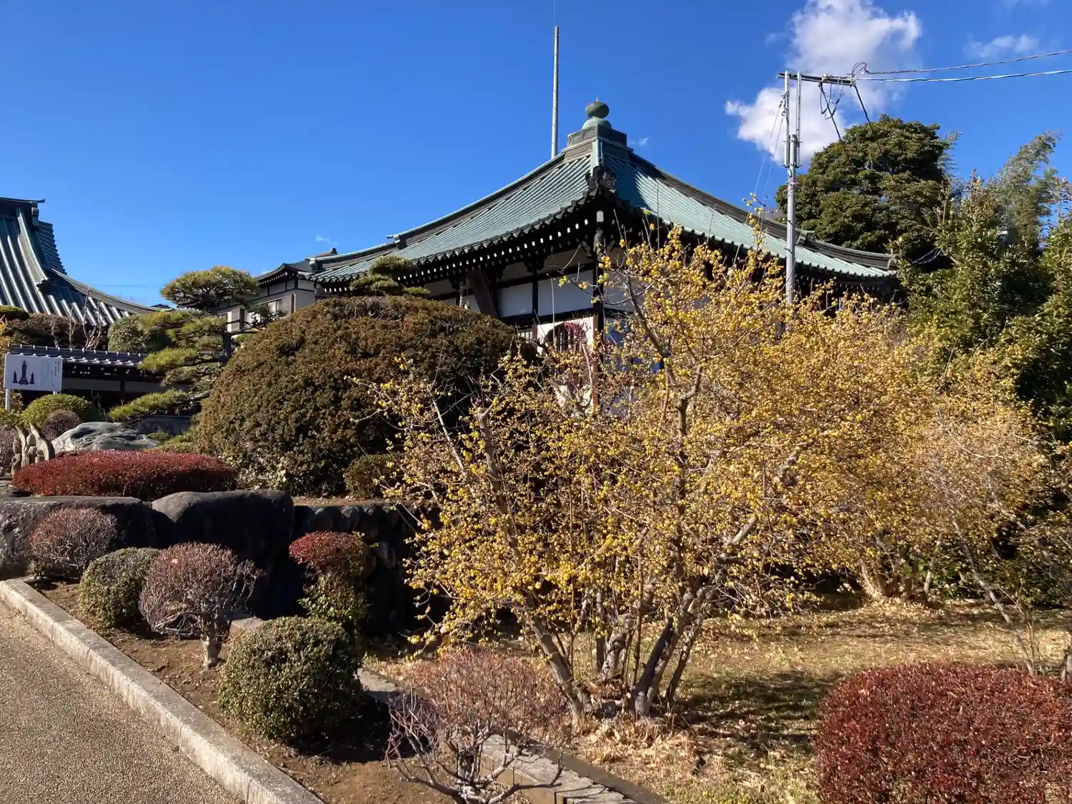 お堂前から見たロウバイの様子