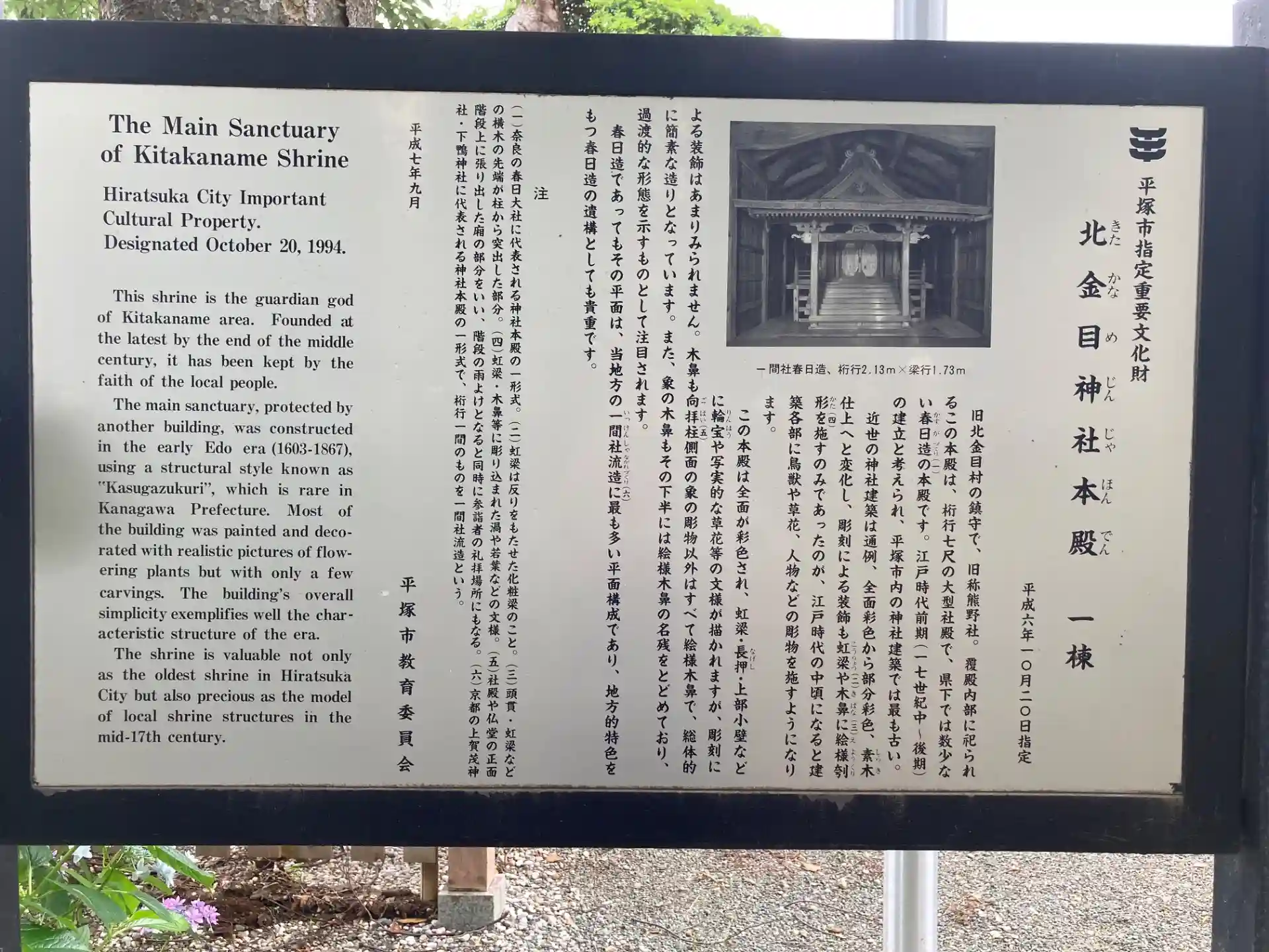 創建年代等は不詳ながら、熊野社と称し、北金目の鎮守として祀られ、徳川家康が関東入国した翌年の天正19年(1591)には社領2石の御朱印状を受領しています。明治維新後の社格制定に際し明治6年村社に列格、北金目神社と改称。大正4年には神饌幣帛料供進神社に指定されていました。