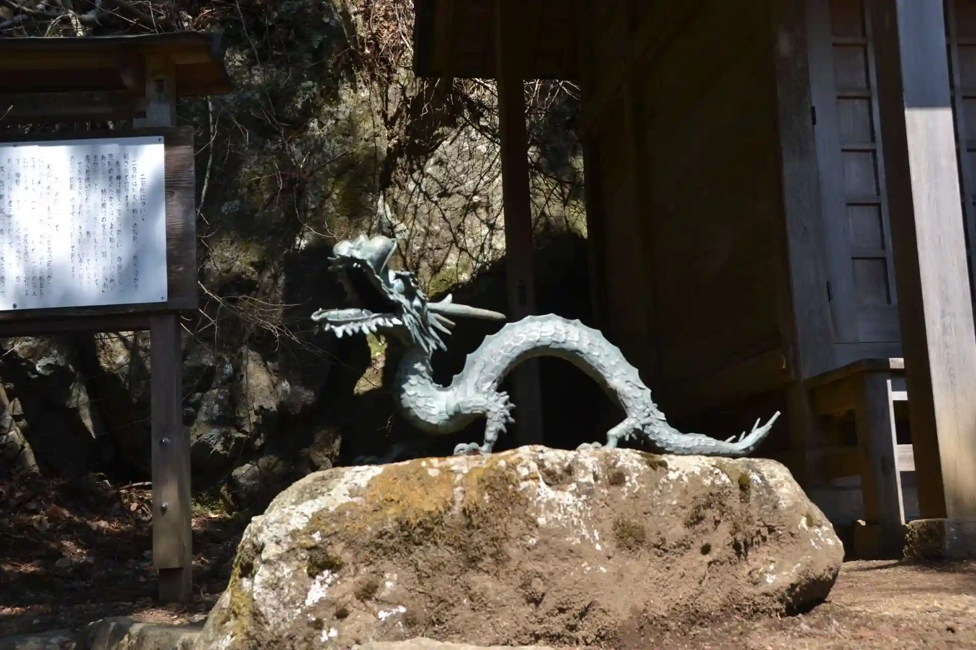 二重滝の脇に、狛龍にまもられたお社があります。