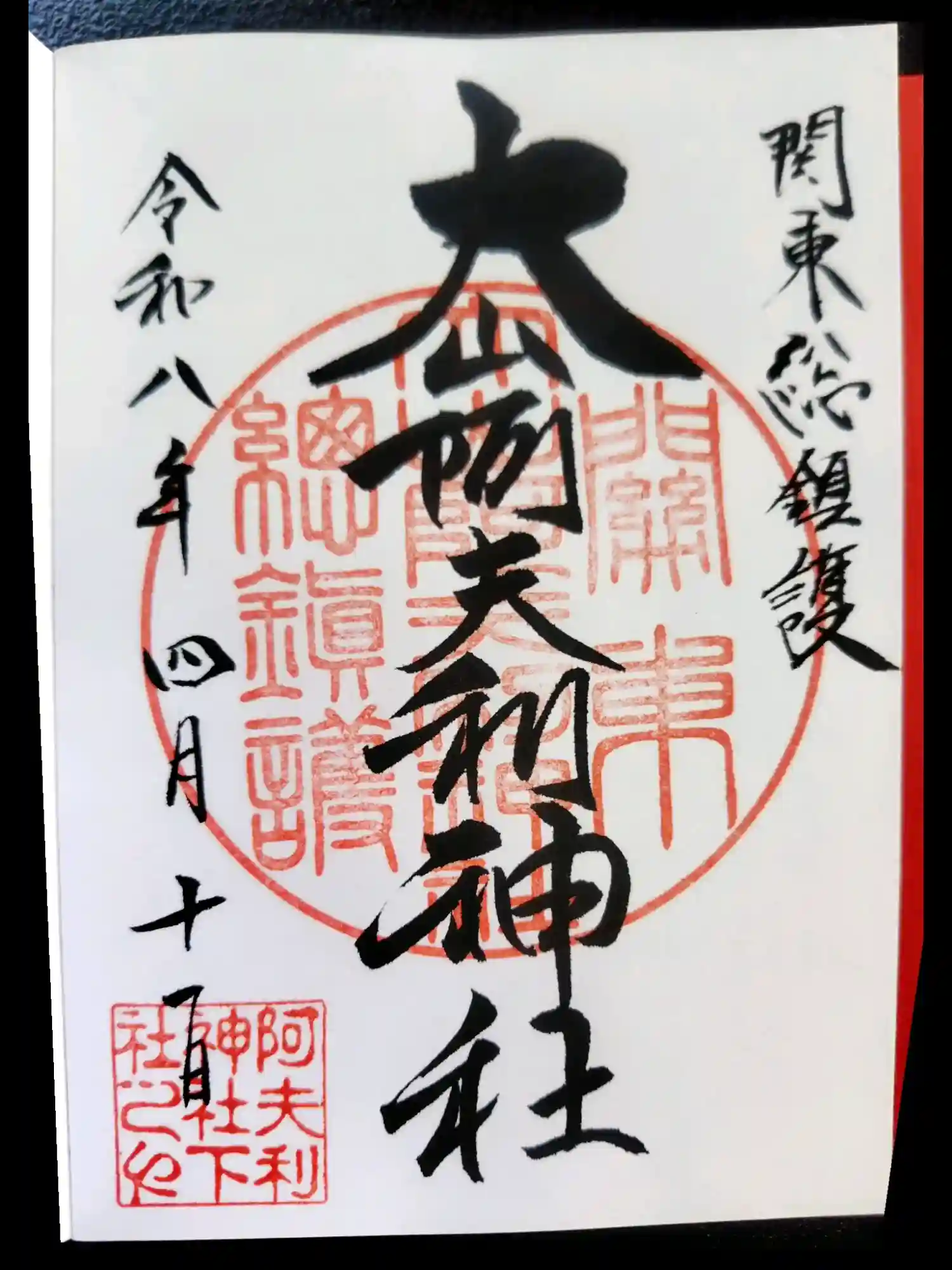 | 御朱印 | あり 右上に関東総鎮守、真ん中に大山阿夫利神社と書かれ、社印が押された御朱印です。