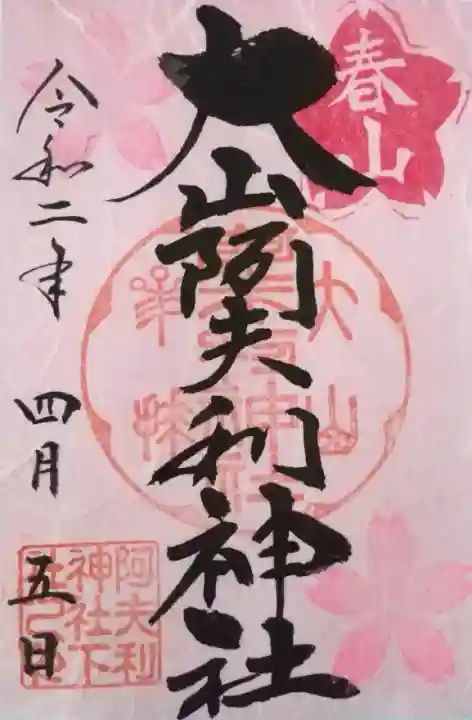 真ん中に大山阿夫利神社と書かれ、右上に春山の桜印、真ん中に大山阿夫利神社参拝の印、上下に桜の印、左下に阿夫利神社下社の印が押されています。