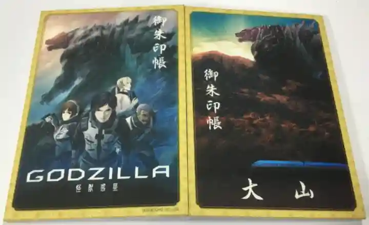 アニメ映画「GODZILLA 怪獣惑星」を記念した御朱印帳で、本映画の舞台が2万年後の丹沢大山になると言うことで、大山に出現したゴジラが描かれ、表面は右上に御朱印帳の文字、下部にGODZILLA 怪獣惑星の文字、裏面は左に御朱印帳の文字、下部に大山の文字が入っています。
