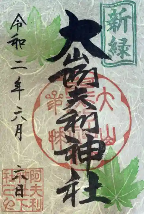 真ん中に大山阿夫利神社と書かれ、右上に新緑の印、真ん中に大山阿夫利神社参拝の印、上下に青紅葉の印、左下に阿夫利神社下社の印が押されています。