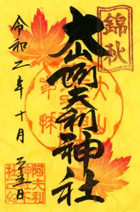 真ん中に大山阿夫利神社と書かれ、右上に錦秋の印、真ん中に大山阿夫利神社参拝の印、上下に紅葉の印、左下に阿夫利神社下社の印が押されています。