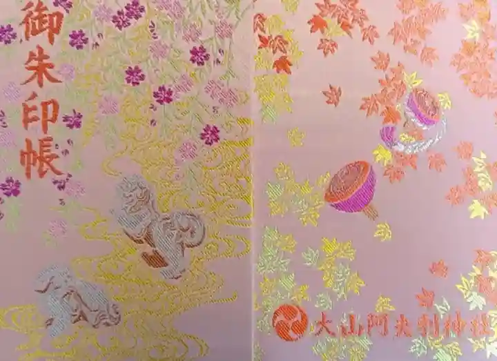 ピンク色の地に、表面は獅子山がデザインされ、左上に御朱印帳の文字、裏面は紅葉と大山こまが描かれ、下部に社紋である三つ巴紋と大山阿夫利神社の文字が入っています。