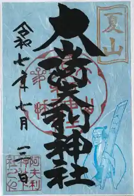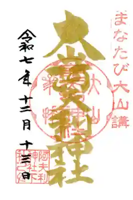 真ん中に大山阿夫利神社と書かれ、右上に夏山の印、真ん中に大山阿夫利神社参拝の印、上下に山ゆりの印、左下に阿夫利神社下社の印が押されています。