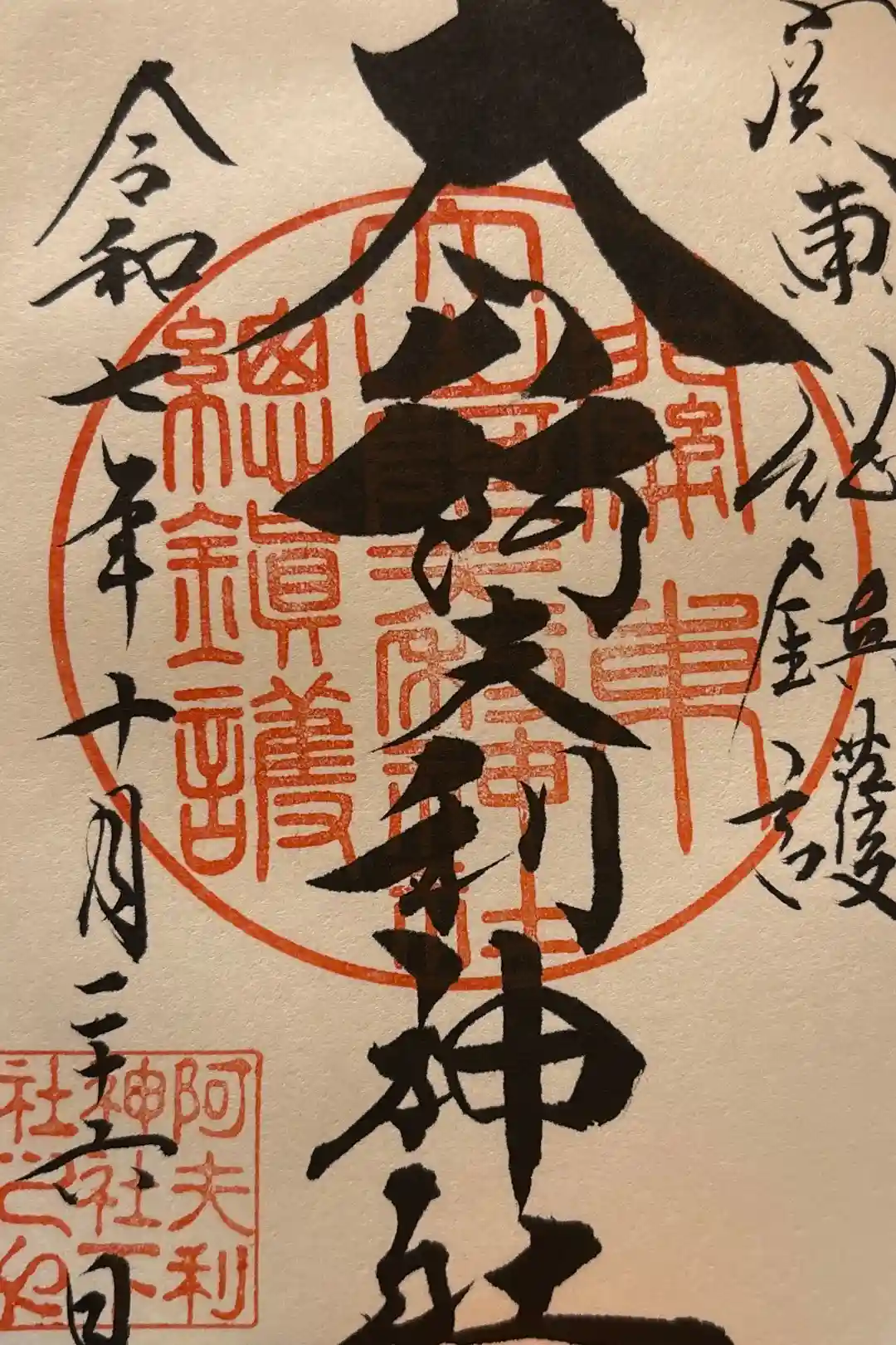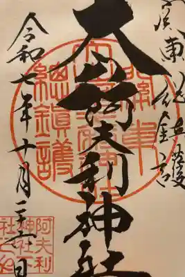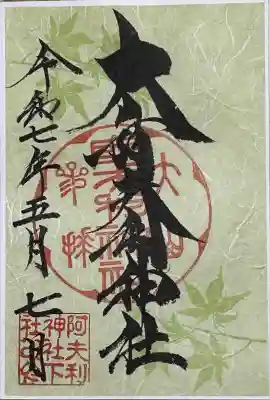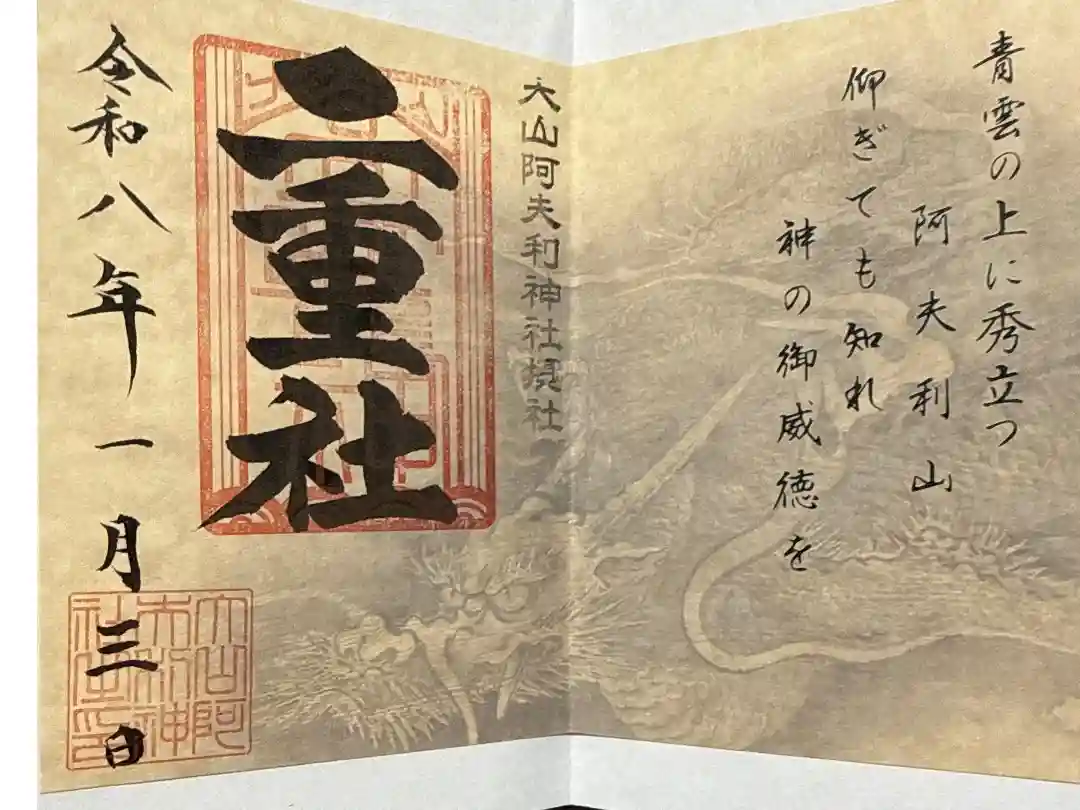 真ん中に大山阿夫利神社と書かれ、右上に新緑の印、真ん中に大山阿夫利神社参拝の印、上下に青紅葉の印、左下に阿夫利神社下社の印が押されています。