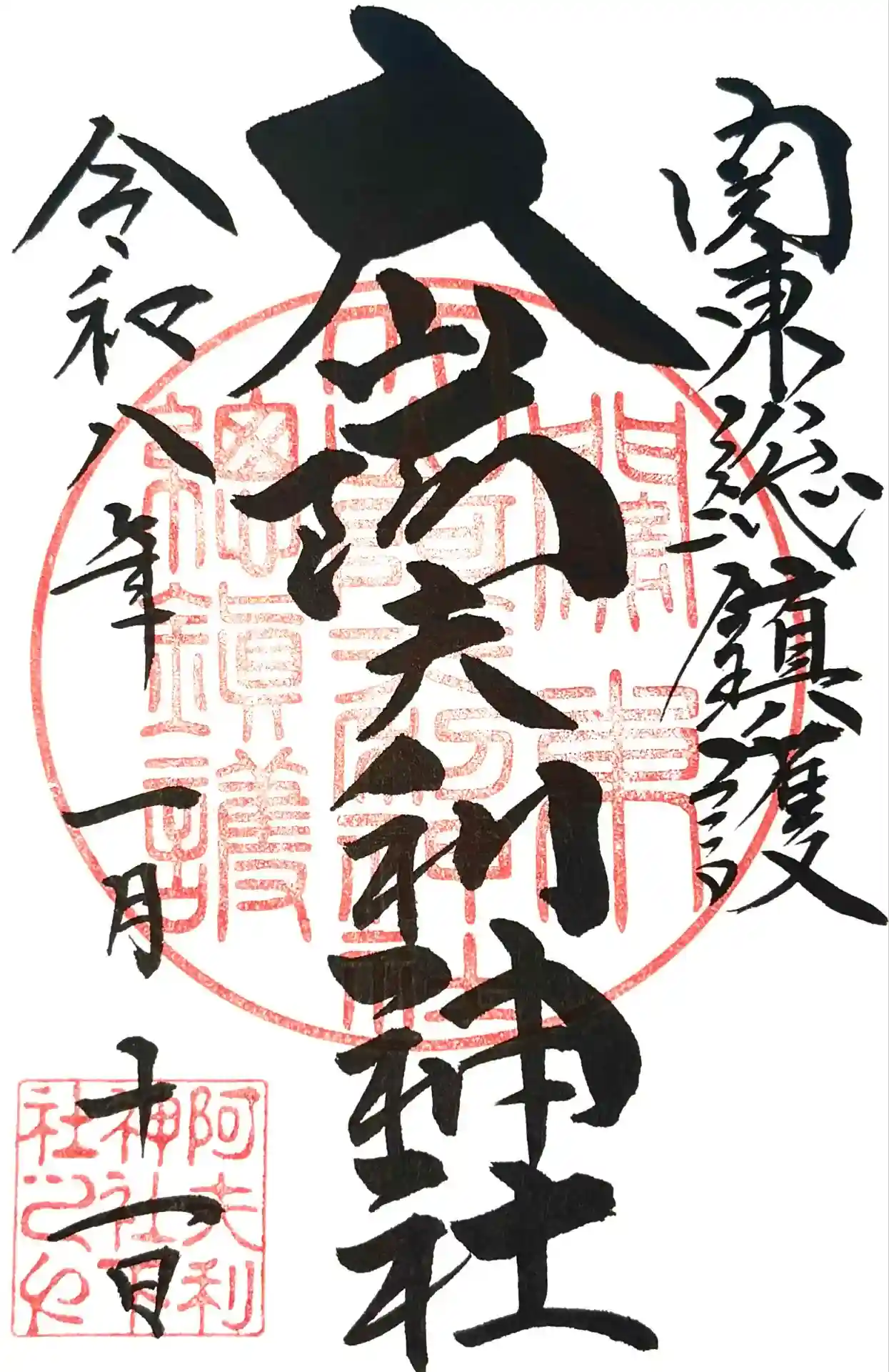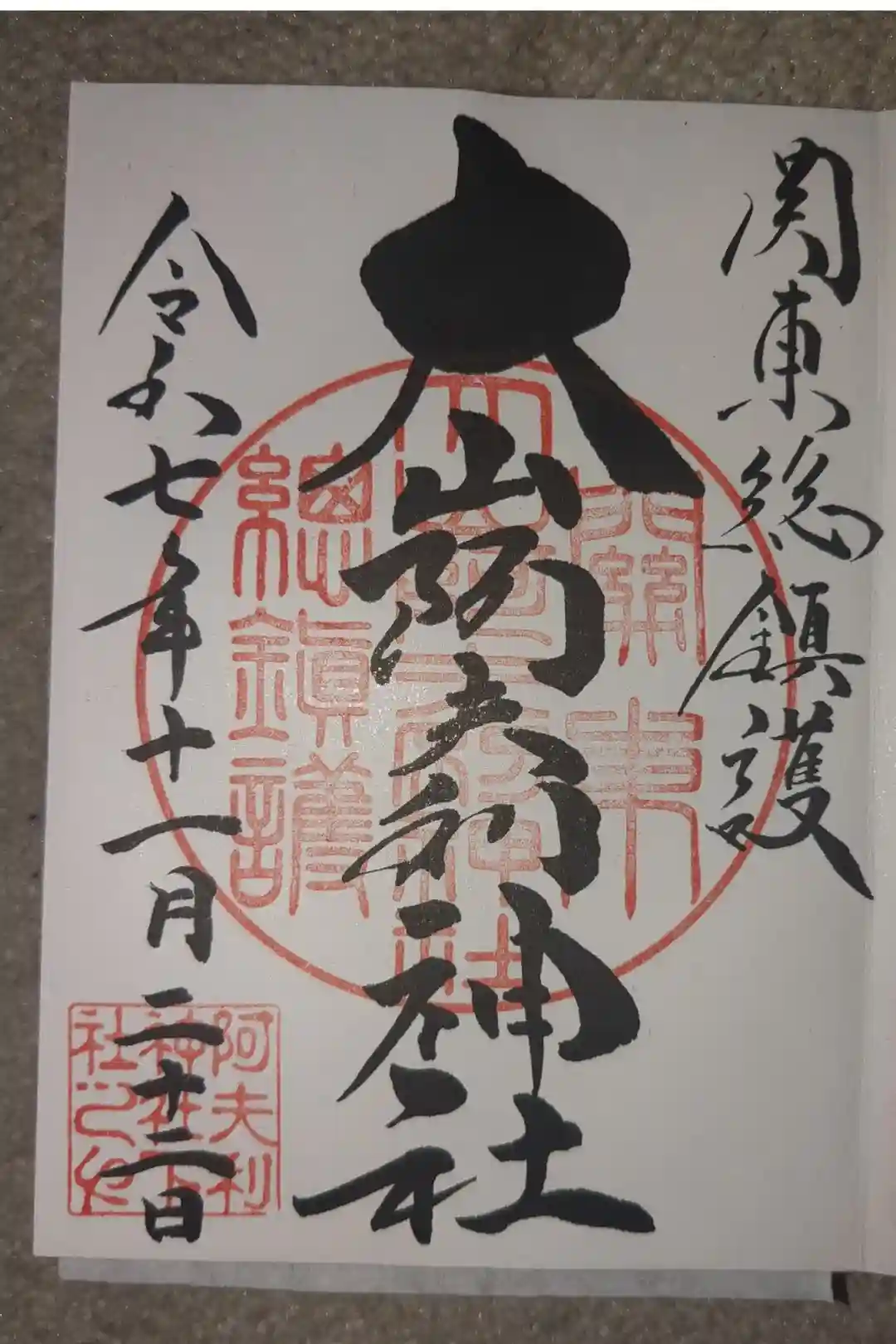 真ん中に大山阿夫利神社と書かれ、右上に関東総鎮護の文字、真ん中に関東大山阿夫利神社総鎮護の印、左下に阿夫利神社下社の印が押されています。