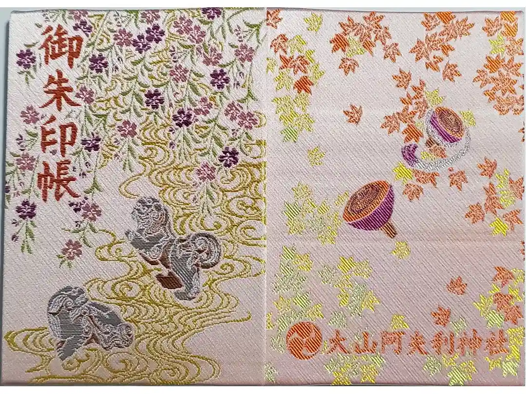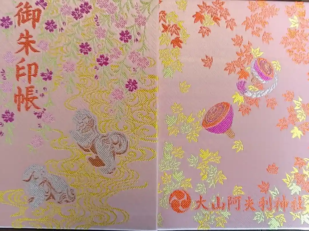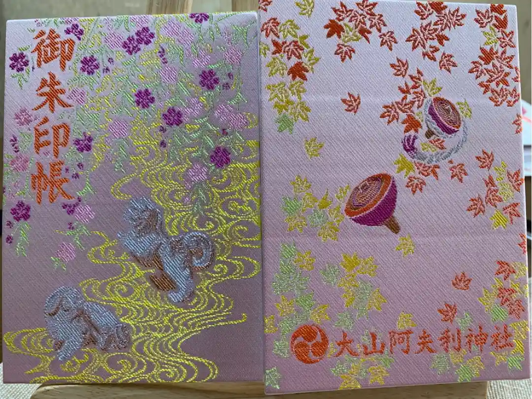 ピンク色の地に、表面は獅子山がデザインされ、左上に御朱印帳の文字、裏面は紅葉と大山こまが描かれ、下部に社紋である三つ巴紋と大山阿夫利神社の文字が入っています。