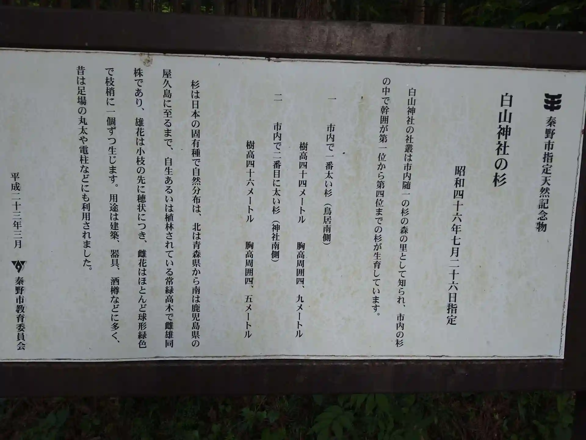 杉林に囲まれたお社、御由緒書というか、市の天然記念物に指定されてる杉の紹介文はありました。