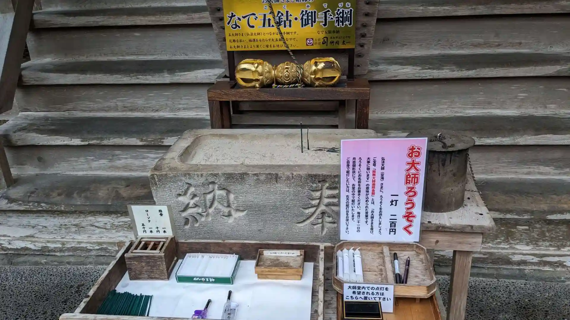一本200円のお大師ろうそくは自分の名前を書いて納めることが出来ます。自分で灯りを付けることも出来ますがそのまま納めれば毎月21日に御堂内で灯りをつけてもらえます。私は自分で灯りをつけその明かりで御線香を焚いて供えました。