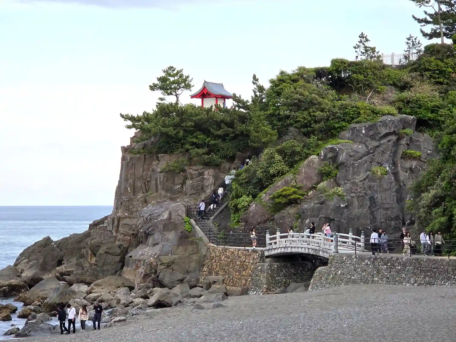 赤い鳥居が印象的な岩の上にせり立つ神社、ここまで登って、桂浜を眺める景色も…