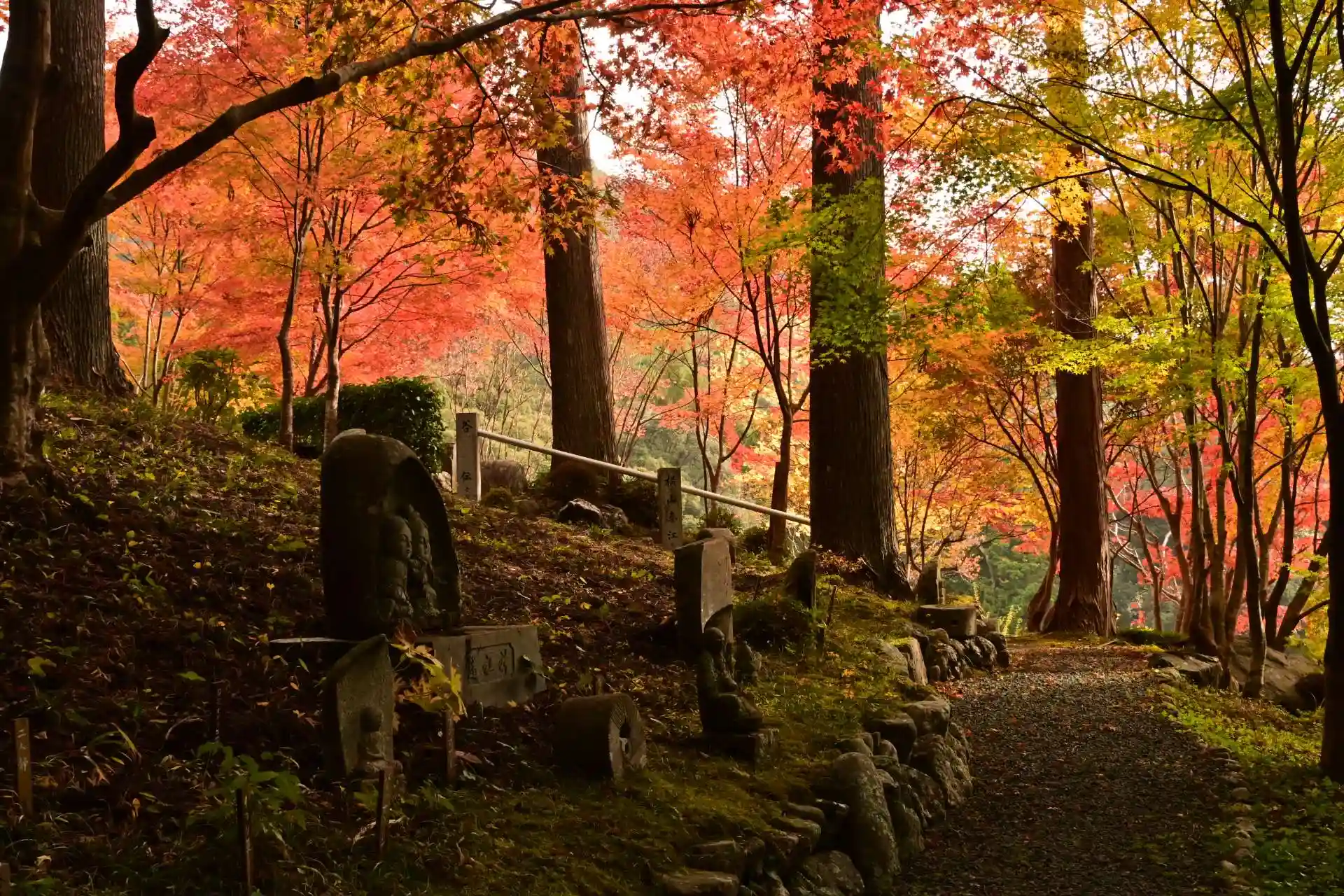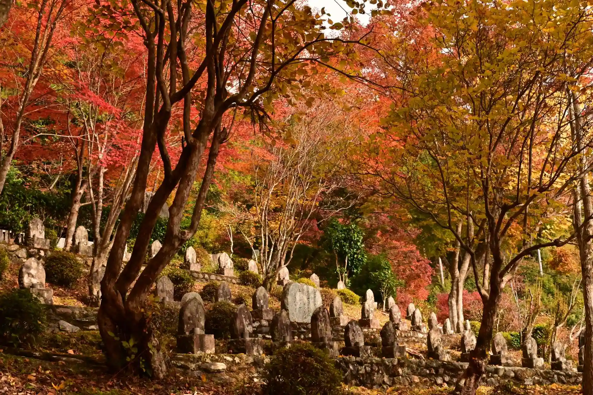 境内には、たくさんの山野草が植栽されています。いまの季節、花は見られませんが、鮮やかな紅葉の彩りが山を覆っていました。