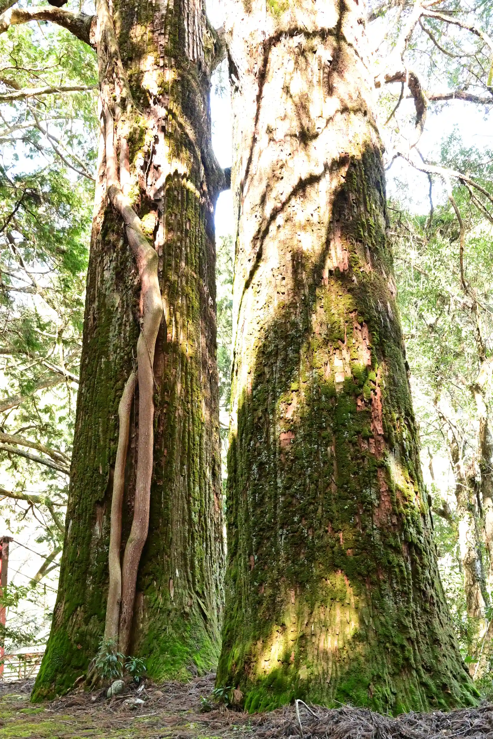 河内神社は、高知県土佐郡土佐町南川、四国の水がめ早明浦ダムの上流に鎮座します。境内には、樹齢700年超と伝わる「夫婦杉」がそびえています。