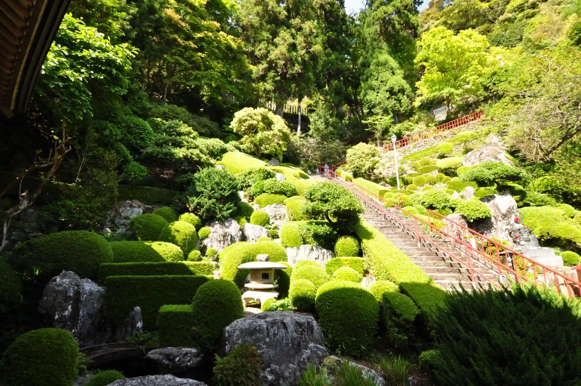 美しい庭園を眺めながら石段を上って本堂へ。手すりの赤と整えられた緑のコントラストが美しい。