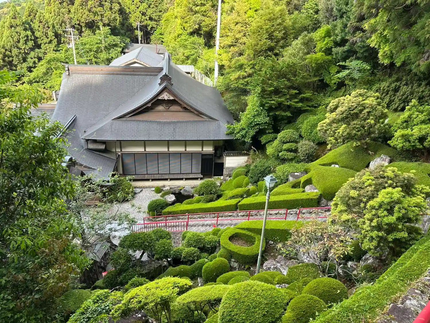 美しい庭園を眺めながら石段を上って本堂へ。手すりの赤と整えられた緑のコントラストが美しい。