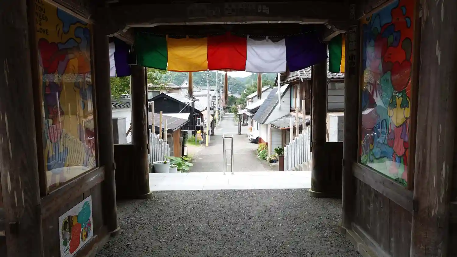 路地の途中に駐車。ポップなアートで愛(LOVE)を感じるお寺でした。