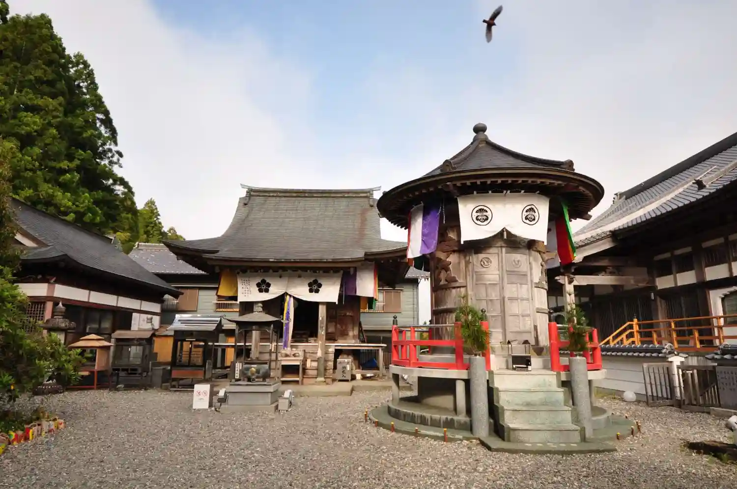 大師堂(左側)と聖天堂(右側手前)。上空で鳥が迎えてくれます。トンビ?
