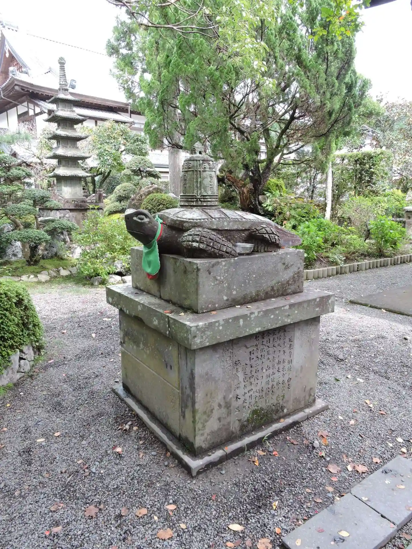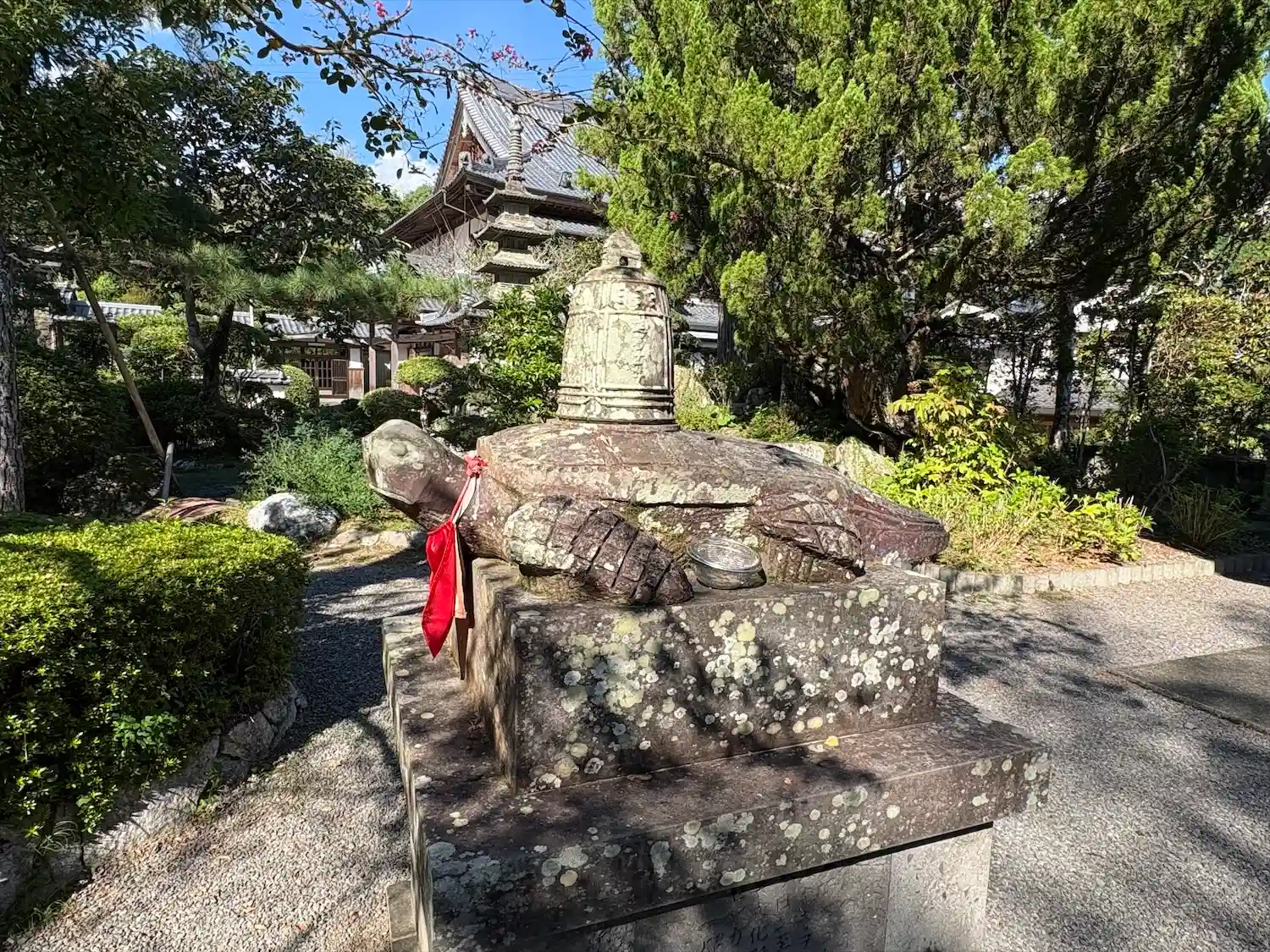 911年、竜宮から銅の梵鐘を背負った赤亀が現れた。その鐘は今も寺に伝わる。赤亀の石像の他にも亀に似せた石や岩が随所に置かれている。