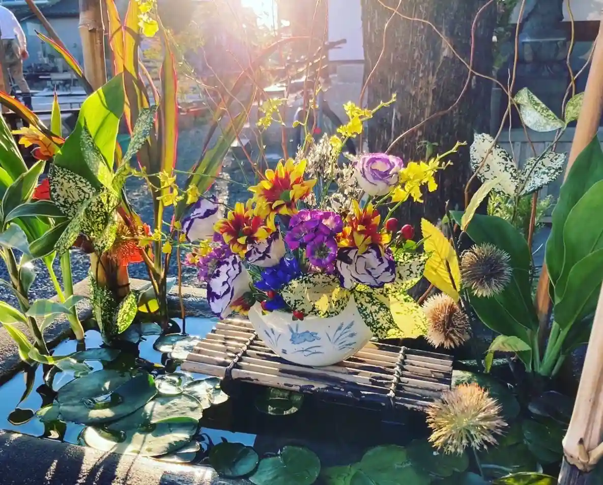 本堂前の花飾りです。花の下をのぞくと、金魚が泳いでいます。