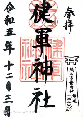 明治6年(1873年)に郷社に列し、昭和以降「たけみや」が「けんぐん」と音読されるようになり、地域名も託麻郡健軍村から熊本市健軍町となった。地域の基礎とも言える神社である。