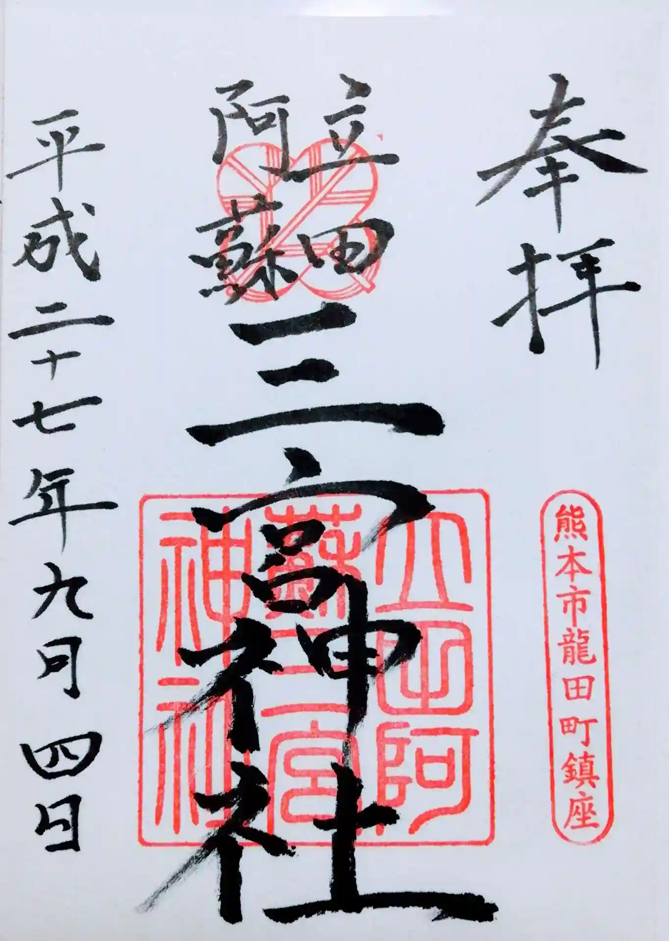 御祭神は国龍神(くにたつのかみ)、比咩御子神 (ひめみこのかみ)、健磐龍命(たけいわたつのみこと)…