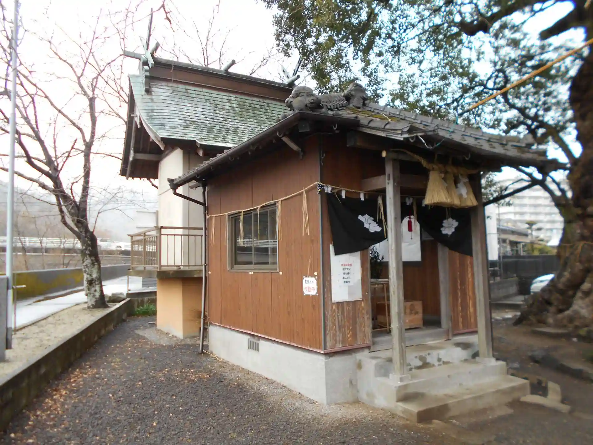 社殿左側の井芹川の向かいには、高橋西神社の御神木の上部が見えます。
