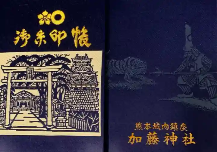 紺色の地に、表面は加藤神社と熊本城の切り絵がデザインされ、上部に桔梗紋と蛇の目紋、その下に御朱印帳の文字が入り、裏面は加藤清正の虎退治の様子が描かれ、下部に熊本城内鎮座 加藤神社の文字が入っています。
