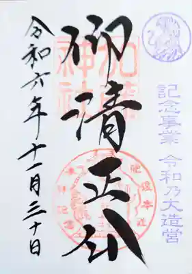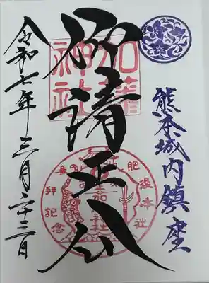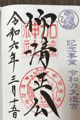 真ん中に仰清正公と書かれ、右に熊本城内鎮座の文字、真ん中上部に加藤神社の印、真ん中下部に熊本城、片鎌槍、蛇の目紋、虎が描かれた「肥後本社 参拝記念 清正公 加藤神社」の印が押されています。