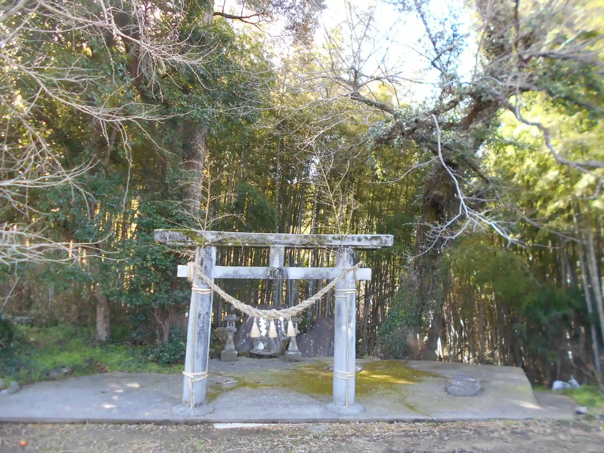 鳥居はありますが、社殿や祠等が無く、御神体の岩と御神木があります。