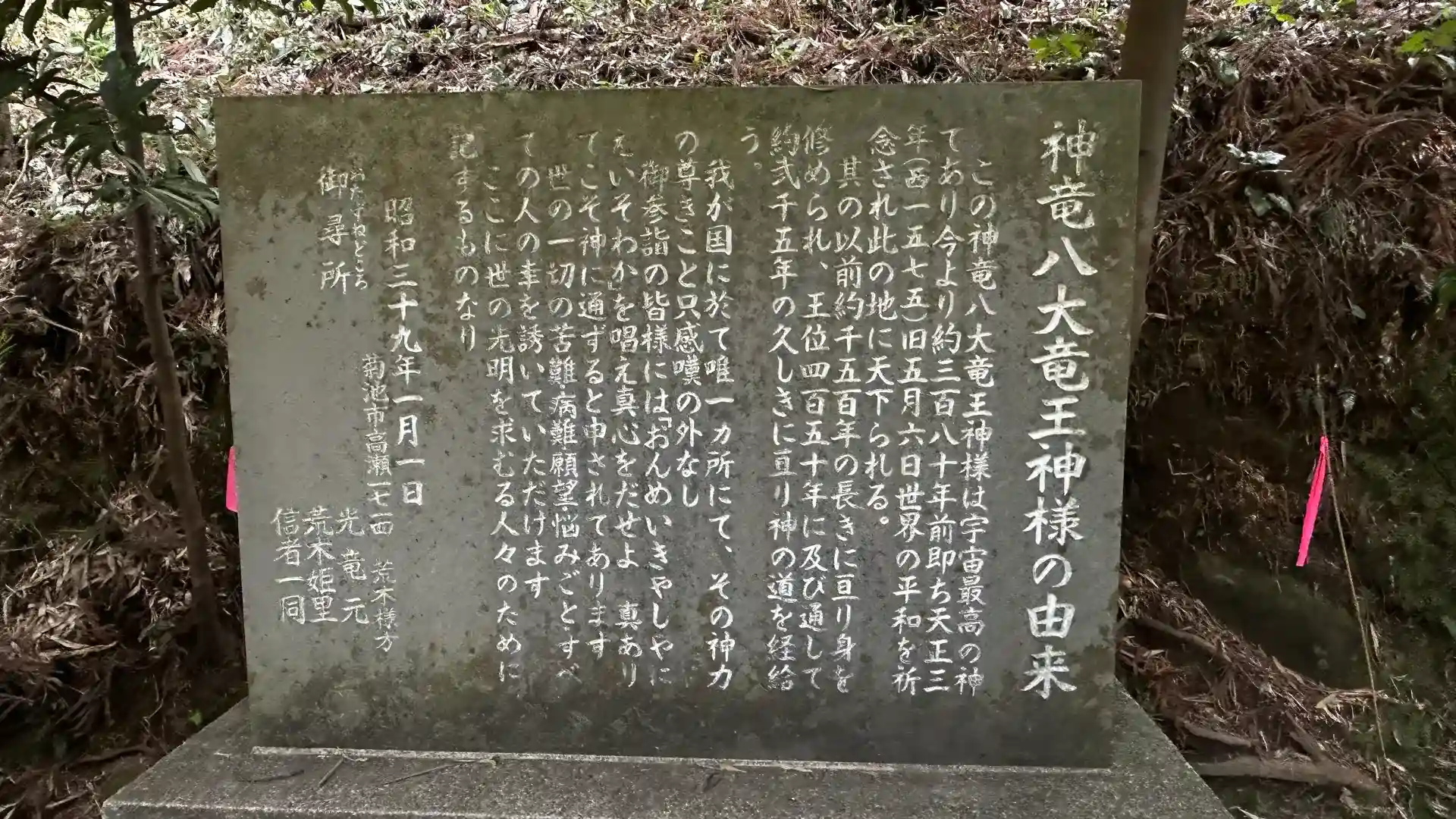 この神竜八大竜王神様は宇宙最高の神であり今より約三百八十年前即ち天正三年(西一五七五)旧五月六日世界の平和を祈念され此の地に天下られる。