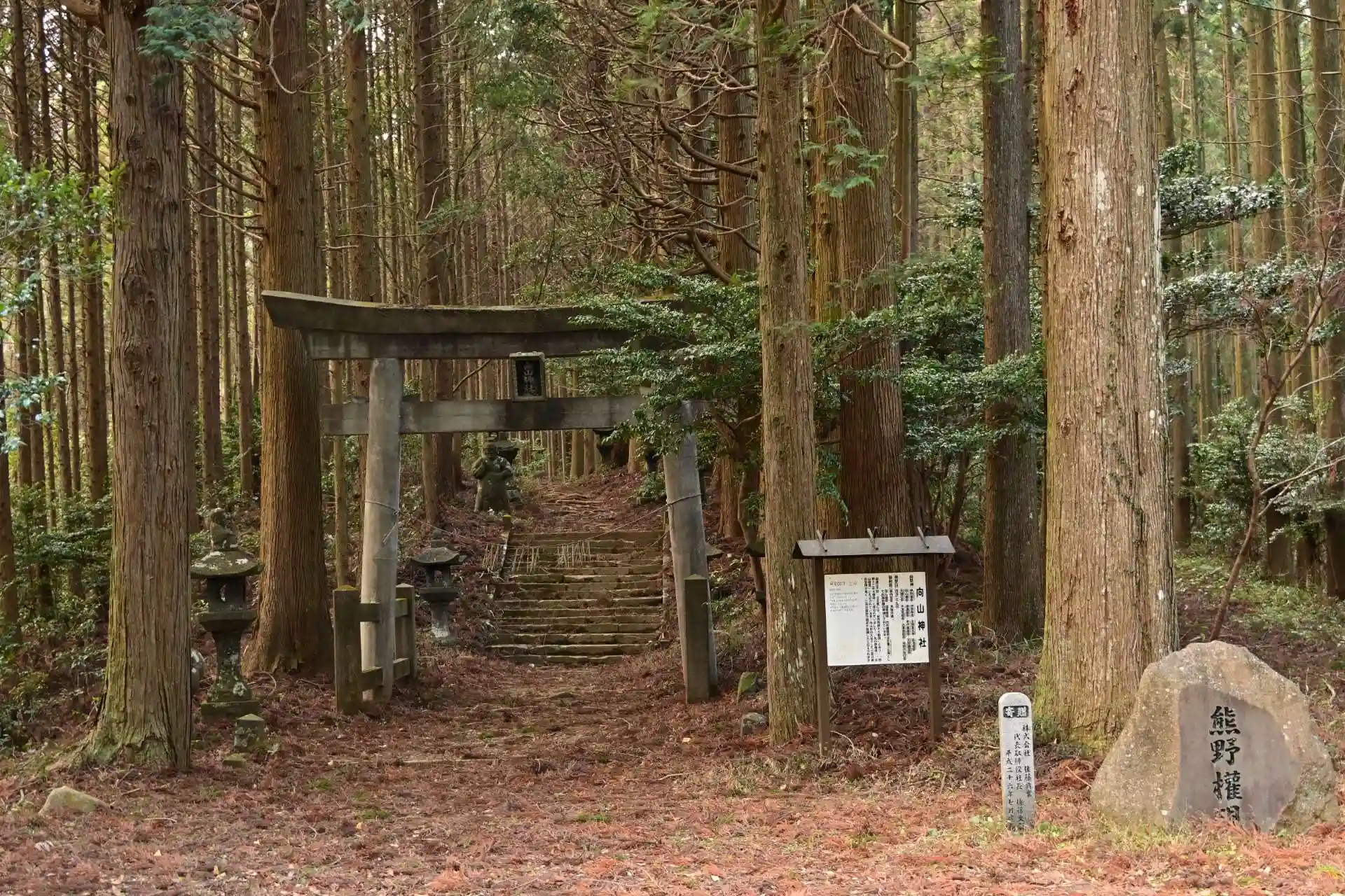向山神社は、宮崎県西臼杵郡高千穂町大字向山、五ヶ瀬川右岸の山間地に鎮座します。古文書によると「紀州熊野から勧請」とあり、「熊野十二社大権現」と呼ばれていました。御祭神は多く12神。