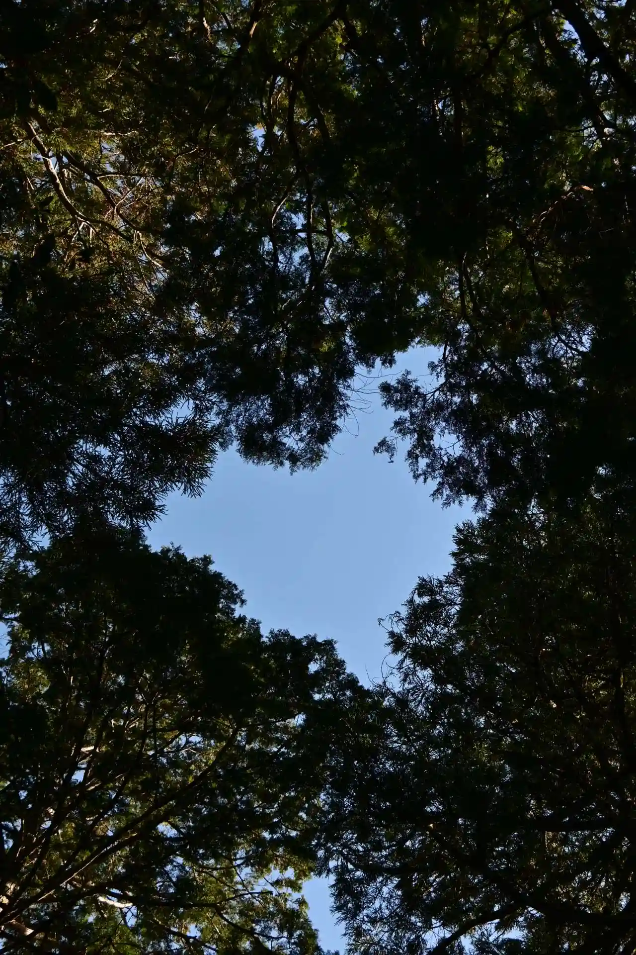 高千穂の中心地からあまり離れていませんが、車で行くのは難所の神社でした。対向車が来ないことを祈りながら、途中、昨晩の強風でしょうか道路に落ちている杉の枝を除きながらそろそろ進みました。不安になりながらも、たどり着いたところにとても神秘的な空間がありました。誰もいない熊野古道を彷彿とさせる参道を500mほど歩いた先に社殿がありました。