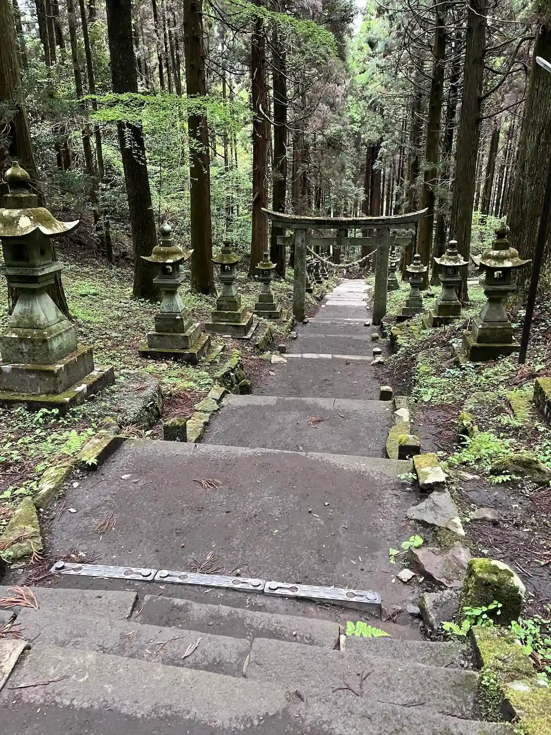 異世界の入口のような苔むした参道。空気が違う。まるで…