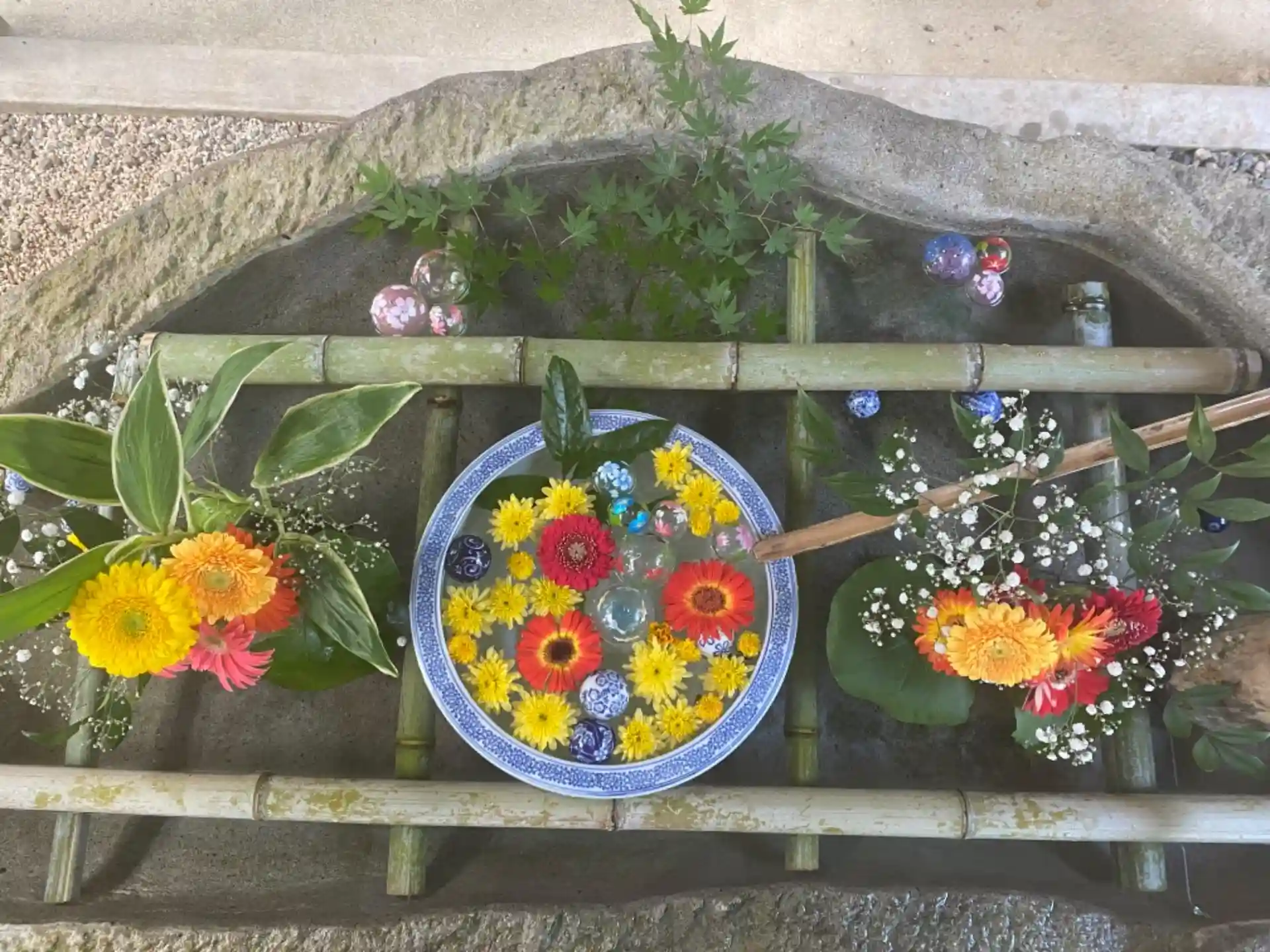 ガーベラや、薔薇の花やビートロを浮かべていますので、ご参拝の折にお楽しみください。🌸