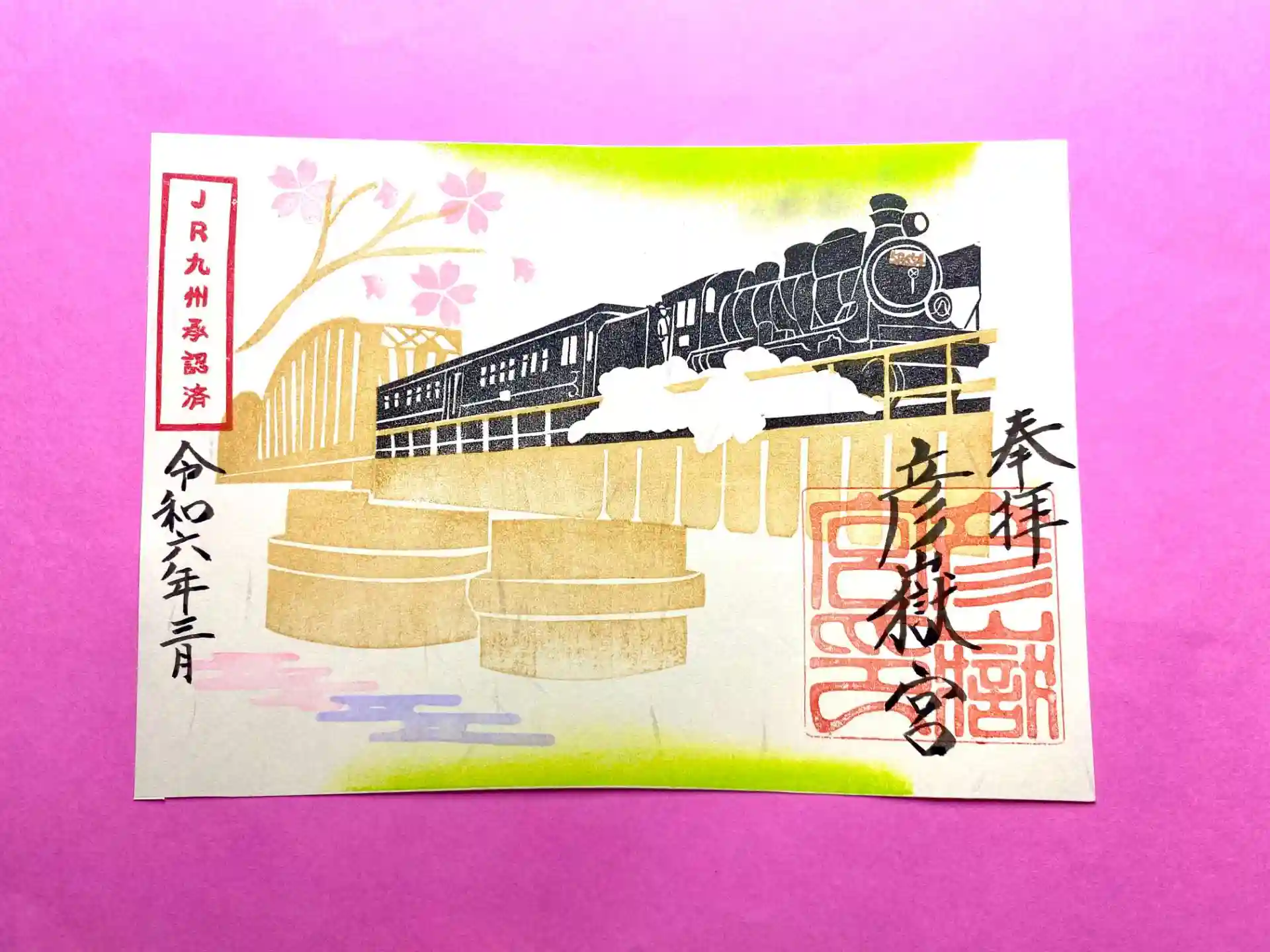 春の桜の時期に走る姿をデザインした、水の都 熊本の季節のご朱印です。