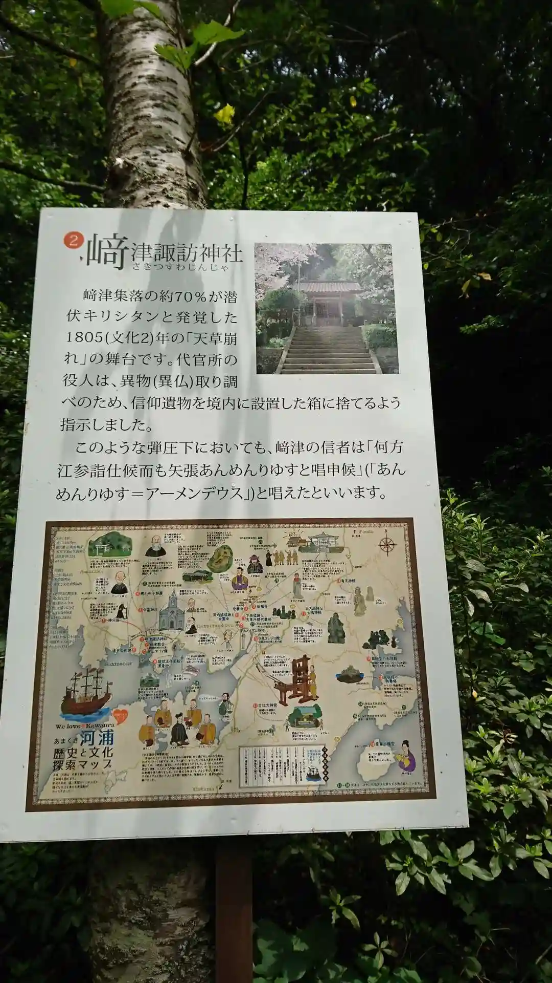 1805年に潜伏キリシタンが発覚する「天草崩れ」の舞台となった神社です。代官所の役人は、異仏取り調べのため、信心具を境内に設置した箱に捨てるよう指示したと記録が残っているそうです。
