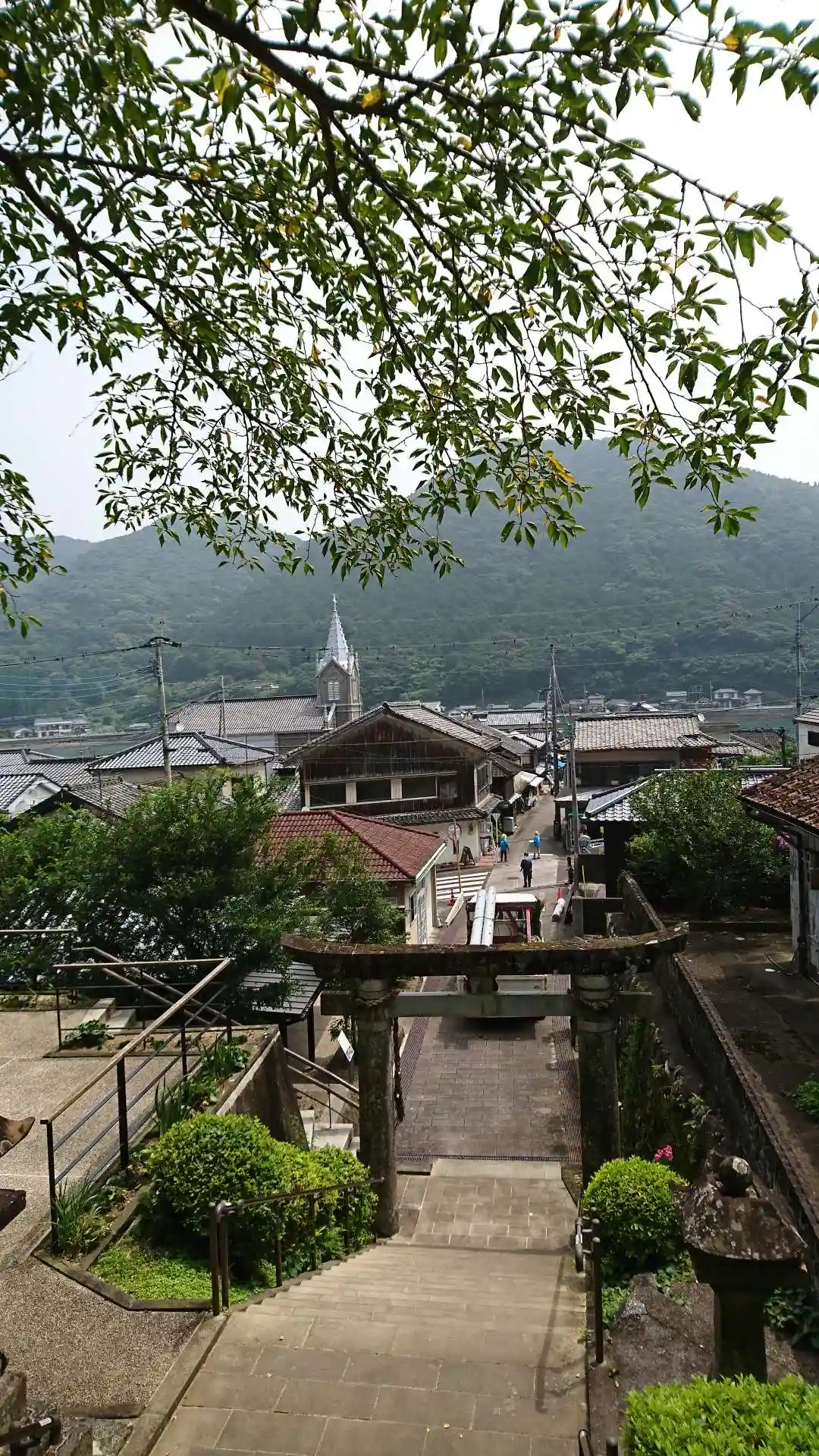 鳥居の向こうに崎津教会が見えます。