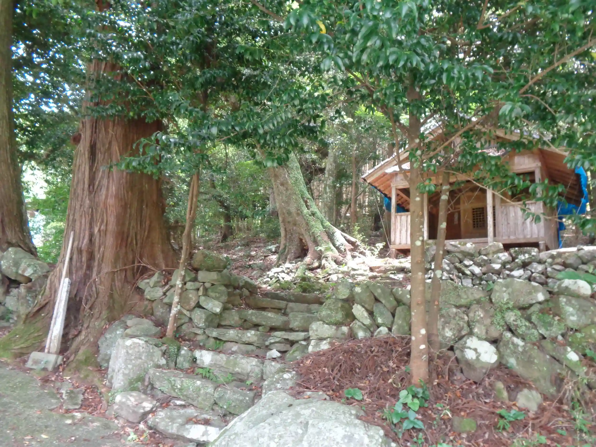 山の急斜面で付近に駐車場は無く、岳本公民館駐車場から平面距離約400m、高低差約40mの道を上り下りして歩いて参拝するしかないようです。