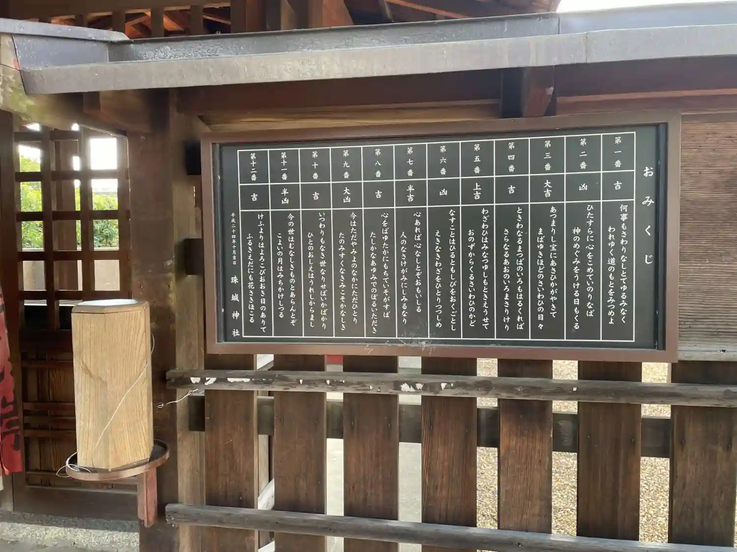おみくじがありましたので御賽銭を入れ引かせてもらいました。表に珍しく大凶があるんやと思い九番来いと…