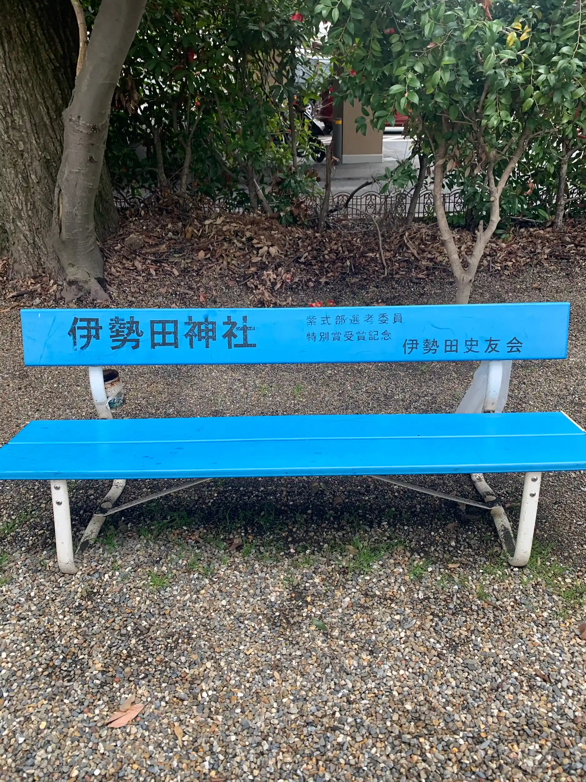 旗や石柱ではなくベンチというところに、神社ですがプラグマティズムを感じます。
