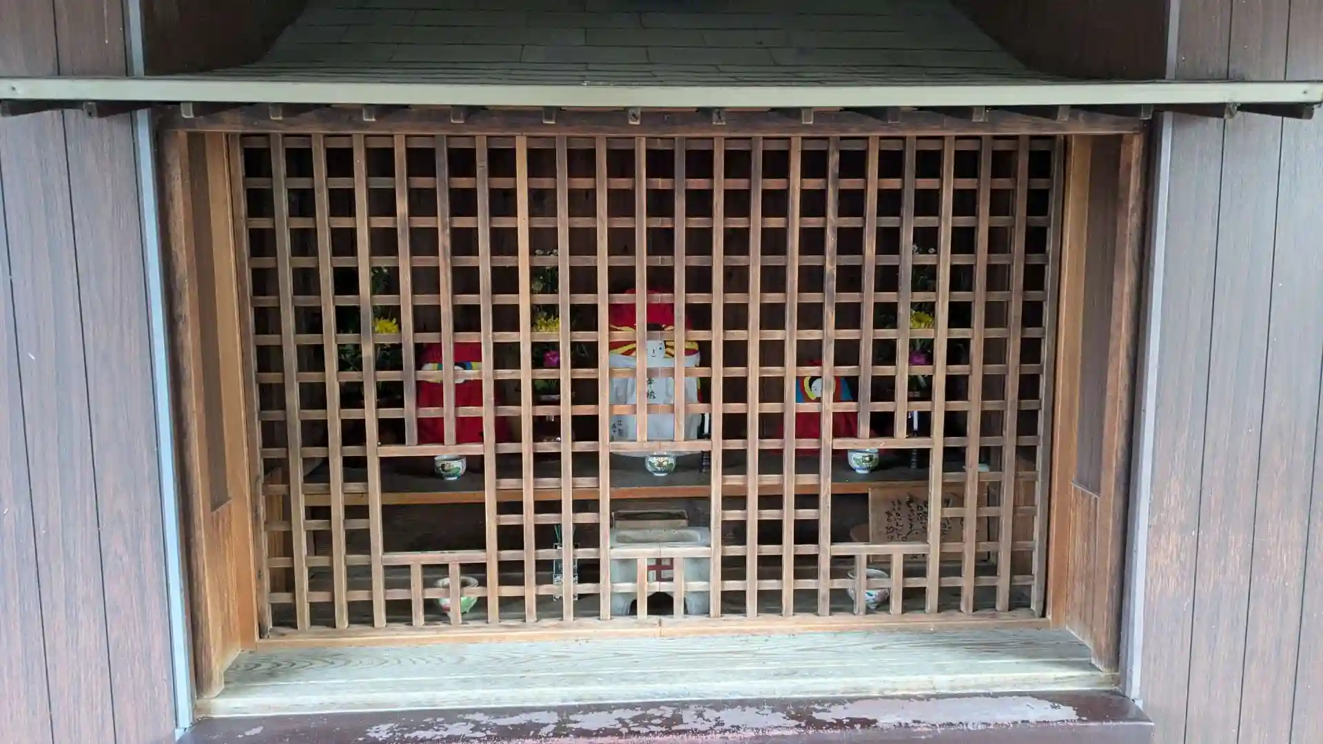 府道15号線沿いから駐車場へと抜けられる卍の付いたコンクリート製の建物がありその中に御堂がありました。並んだ3体のお地蔵様は色が塗られてカラフルです。