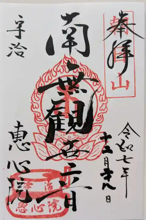 宇治神社のすぐ隣にありました。弘法大師が建立した龍泉寺が始まりで平安時代中期に恵心僧都が再興してからは恵心院と称するようになりました。御本尊の木造十一面観音立像は宇治市指定文化財。境内の御庭には様々な木々が植えられています。道民なので産まれて初めてバショウの木を見て「宇治にバナナの木がある!」と思ってしまいました(笑)本堂に参拝してから寺務所で書き置きの御朱印を頂きました。