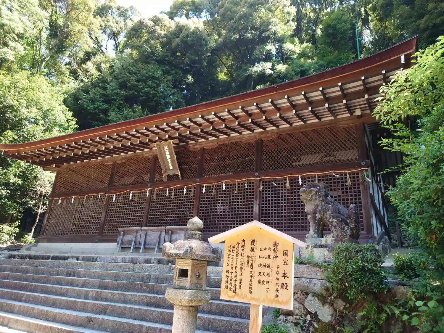 世界遺産、本殿は平安時代後期の造営で、神社建築としては現存最古とされる。拝殿は鎌倉時代前期の造営で…