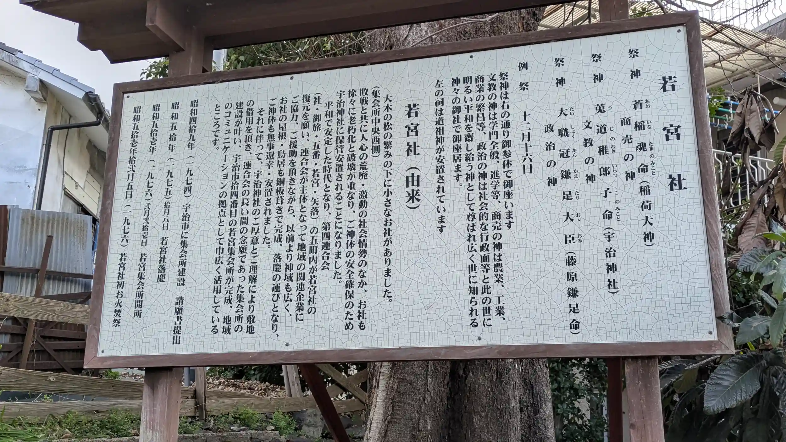 高砂あさっぴーさんの投稿にあったの若宮社へお詣り。JR宇治駅の西側なのであまり行かない方面で下から全く気付いてませんでした😅あざ~す😊宇治児童遊園の一角にあり、集会所もありました。案内によると宇治神社から借地とあるので独立した神社ではあるようです。すぐ左手には宇治神社の御旅所へ続く階段がありました。御祭神は菟道稚郎子命、藤原鎌足、「蒼」稲魂命。倉稲魂命の「倉」が「蒼」になっており、読みも「あおいなたまのみこと」になってました。何か意味があるのかな?特に何も記載はなかったのですがまあ気にはなるなぁ・・・😅